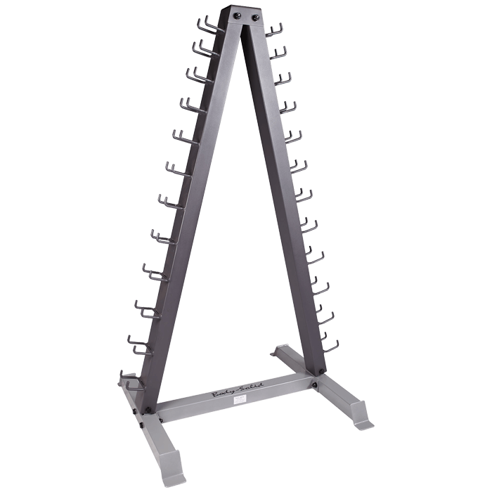 Keep your dumbbells close at hand with the all-new Body-Solid Tools GDR24 12-Pair Vertical Dumbbell Rack. Designed to hold up to twelve vinyl or neoprene dumbbells ranging from one to 15 lbs., this rack is the perfect complement to any workout space. The space-saving design includes individual cradles for each dumbbell and solid steel construction ensures durability in any setting. The GDR24 12-Pair Vertical Dumbbell Rack is the ideal storage option for both home or commercial use.